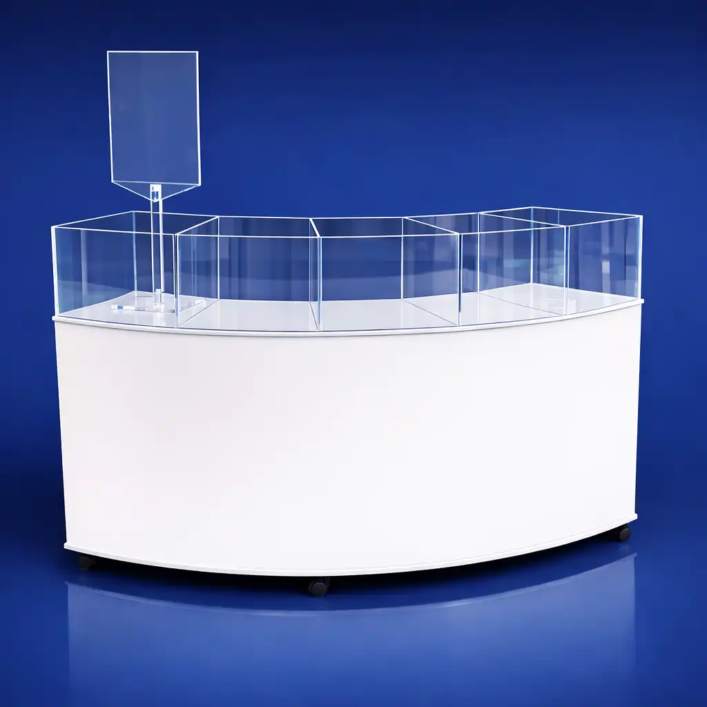 Espositore banco curvo con ruote composto di 5 cesti in trasparente su un banco di pvc bianco con porta depliant A4 su asta trasparente spostabile. Cod. 2720 AG