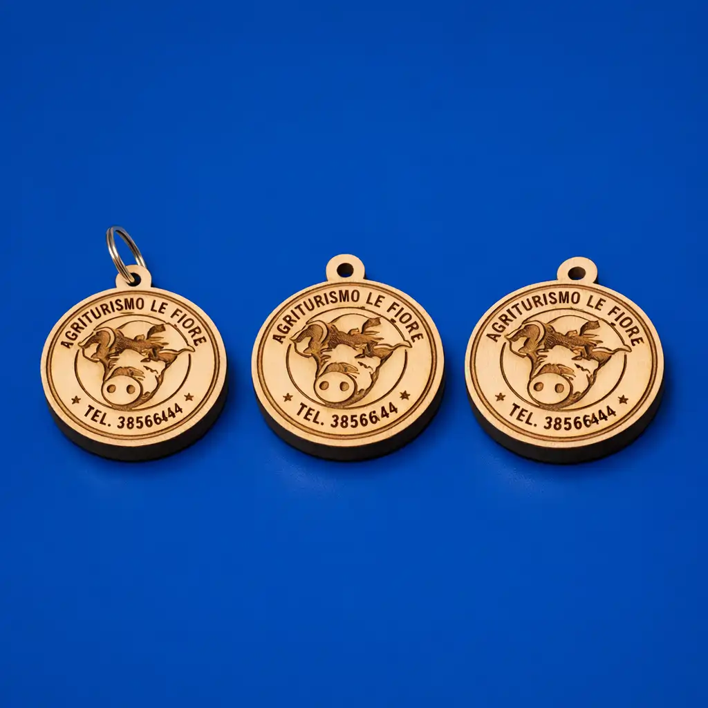 I portachiavi in legno con marcatura laser sono realizzati per un agriturismo del bolognese, con incisione precisa e duratura. La decorazione riporta la testa di Giorgio, il maiale porta fortuna, simbolo di autenticità e buon auspicio. Ogni pezzo è lavorato con cura artigianale, valorizzando il calore del legno naturale e la nitidezza della marcatura laser.
